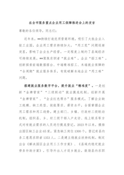 / 【七哥公文】2024年:在全市服务重点企业用工保障推进会上的发言+更多免费公文+VX:QiGeGongWen2024