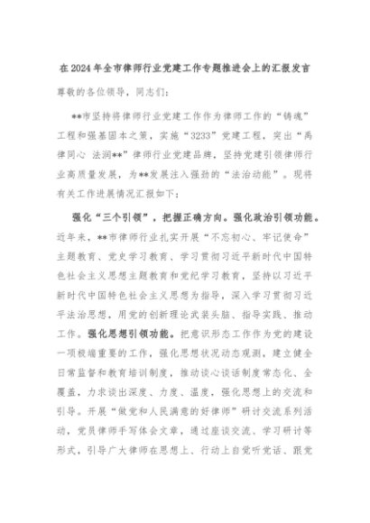 【七哥公文】2024年:在2024年全市律师行业党建工作专题推进会上的汇报发言+更多免费公文+VX:QiGeGongWen2024