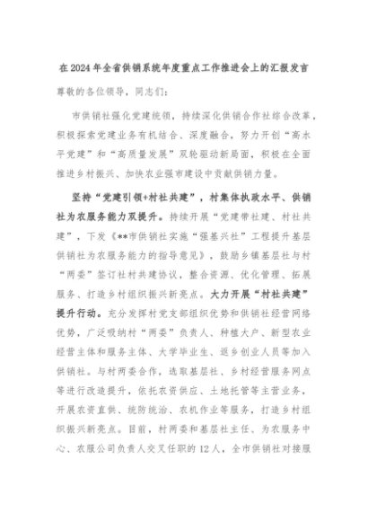 【七哥公文】2024年:在2024年全省供销系统年度重点工作推进会上的汇报发言+更多免费公文+VX:QiGeGongWen2024