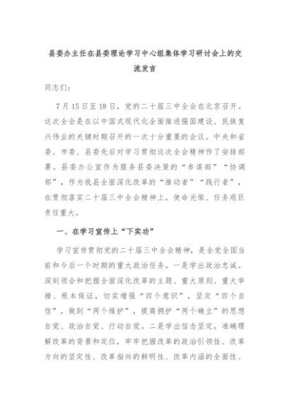 【七哥公文】2024年:县委办主任在县委理论学习中心组集体学习研讨会上的交流发言+更多免费公文+VX:QiGeGongWen2024