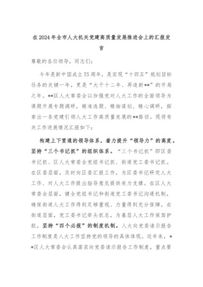 【七哥公文】2024年:在2024年全市人大机关党建高质量发展推进会上的汇报发言+更多免费公文+VX:QiGeGongWen2024