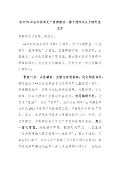 【七哥公文】2024年:在2024年全市国有资产资源盘活工作专题推进会上的交流发言+更多免费公文+VX:QiGeGongWen2024