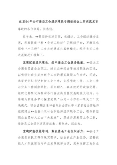 【七哥公文】2024年:在2024年全市基层工会组织建设专题推进会上的交流发言+更多免费公文+VX:QiGeGongWen2024