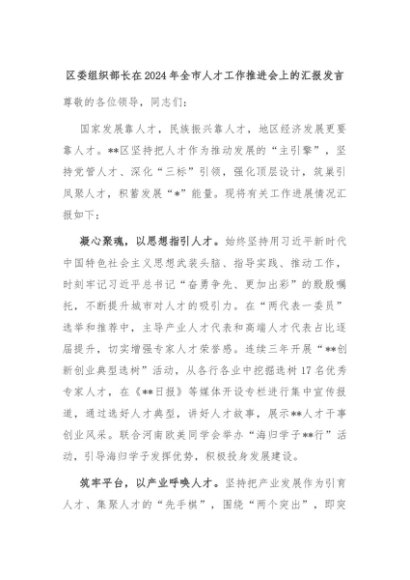 【七哥公文】2024年:区委组织部长在2024年全市人才工作推进会上的汇报发言+更多免费公文+VX:QiGeGongWen2024