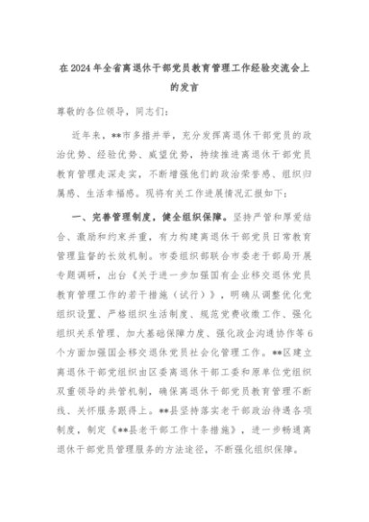 【七哥公文】2024年:在2024年全省离退休干部党员教育管理工作经验交流会上的发言+更多免费公文+VX:QiGeGongWen2024