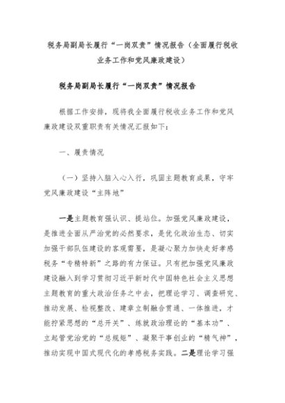 【七哥公文】2024年:税务局副局长履行“一岗双责”情况报告(全面履行税收业务工作和党风廉政建设)+更多免费公文+VX:QiGeGongWen2024