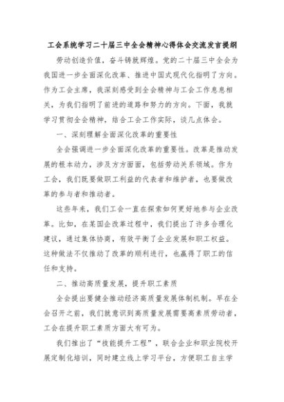【七哥公文】2024年:工会系统学习二十届三中全会精神心得体会交流发言提纲+更多免费公文+VX:QiGeGongWen2024