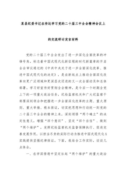 【七哥公文】2024年:某县纪委书记在传达学习党的二十届三中全会精神会议上的交流研讨发言材料+更多免费公文+VX:QiGeGongWen2024
