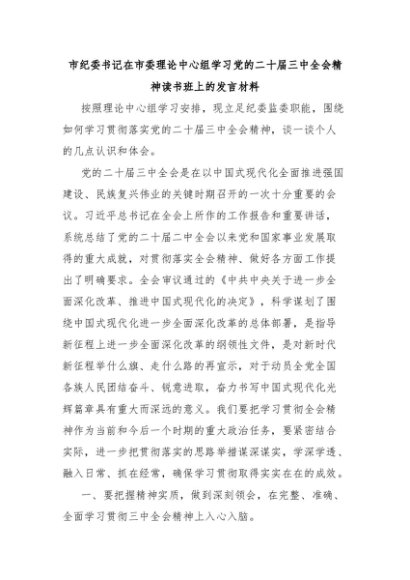 【七哥公文】2024年:市纪委书记在市委理论中心组学习党的二十届三中全会精神读书班上的发言材料+更多免费公文+VX:QiGeGongWen2024