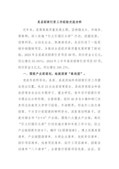 / 【七哥公文】2024年:某县招商引资工作经验交流材料+更多免费公文+VX:QiGeGongWen2024