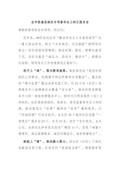 / 【七哥公文】2024年:在市委基层减负专项督导会上的汇报发言+更多免费公文+VX:QiGeGongWen2024