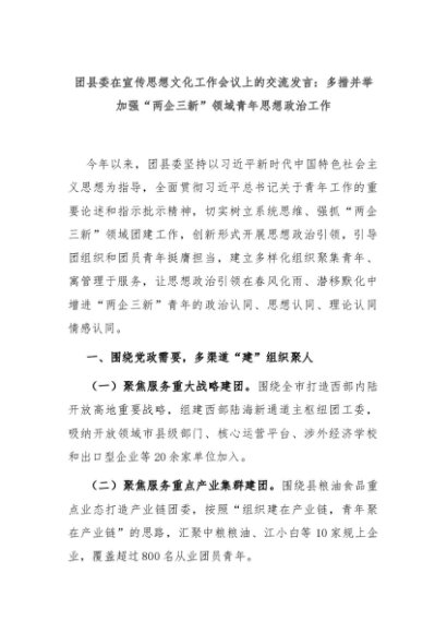 【七哥公文】2024年:团县委在宣传思想文化工作会议上的交流发言:多措并举加强“两企三新”领域青年思想政治工作+更多免费公文+VX:QiGeGongWen2024