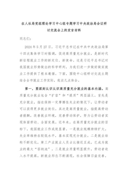 【七哥公文】2024年:在人社局党组理论学习中心组专题学习中央政治局会议研讨交流会上的发言材料+更多免费公文+VX:QiGeGongWen2024
