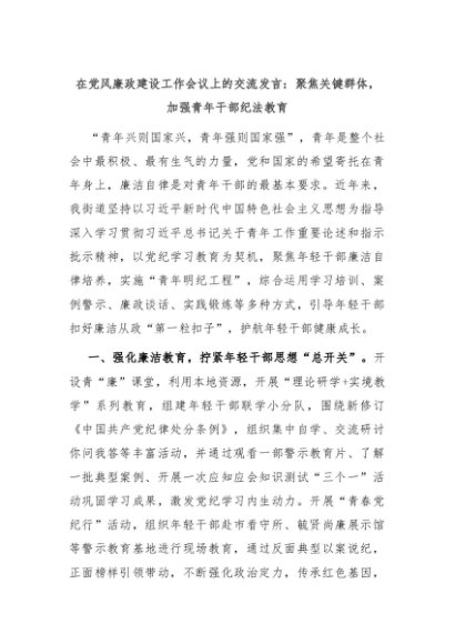 【七哥公文】2024年:在党风廉政建设工作会议上的交流发言:聚焦关键群体,加强青年干部纪法教育+更多免费公文+VX:QiGeGongWen2024