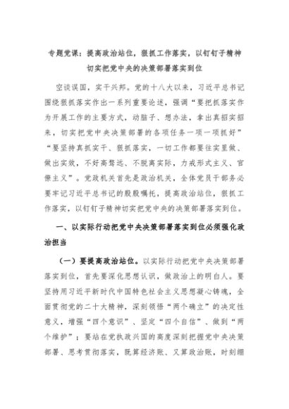 【七哥公文】2024年:专题党课:提高政治站位,狠抓工作落实,以钉钉子精神切实把党中央的决策部署落实到位+更多免费公文+VX:QiGeGongWen2024