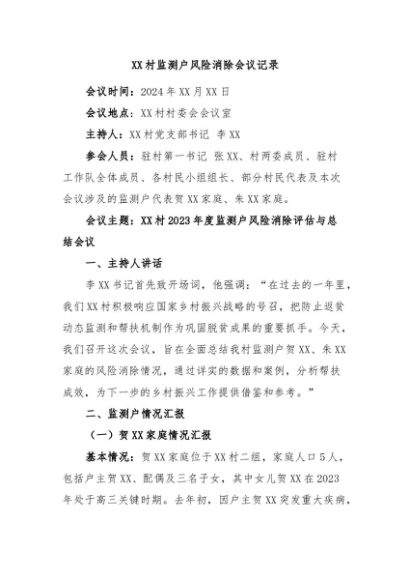 / 【七哥公文】2024年:XX村监测户风险消除会议记录+更多免费公文+VX:QiGeGongWen2024