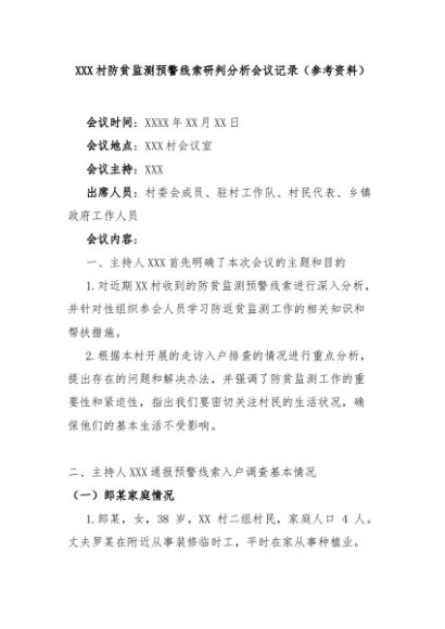 【七哥公文】2024年:XXX村防贫监测预警线索研判分析会议记录(参考资料)+更多免费公文+VX:QiGeGongWen2024