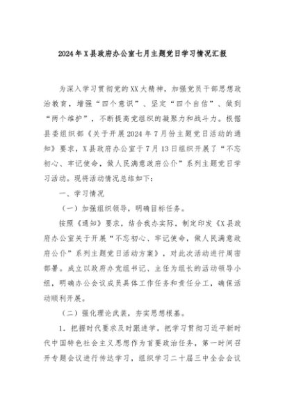 / 【七哥公文】2024年:2024年X县政府办公室七月主题党日学习情况汇报+更多免费公文+VX:QiGeGongWen2024
