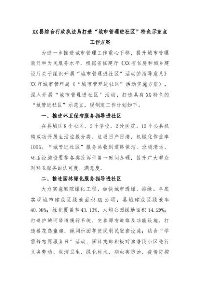 【七哥公文】2024年:XX 县综合行政执法局打造“城市管理进社区” 特色示范点工作方案+更多免费公文+VX:QiGeGongWen2024