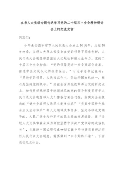 【七哥公文】2024年:在市人大党组专题传达学习党的二十届三中全会精神研讨会上的交流发言+更多免费公文+VX:QiGeGongWen2024