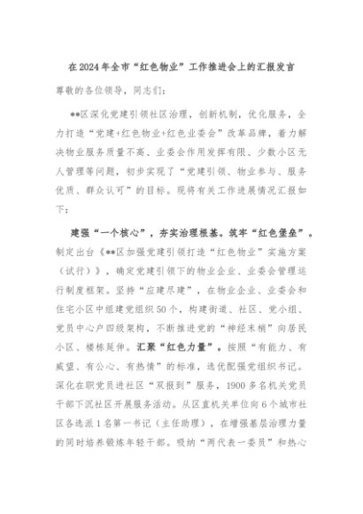【七哥公文】2024年:在2024年全市“红色物业”工作推进会上的汇报发言+更多免费公文+VX:QiGeGongWen2024