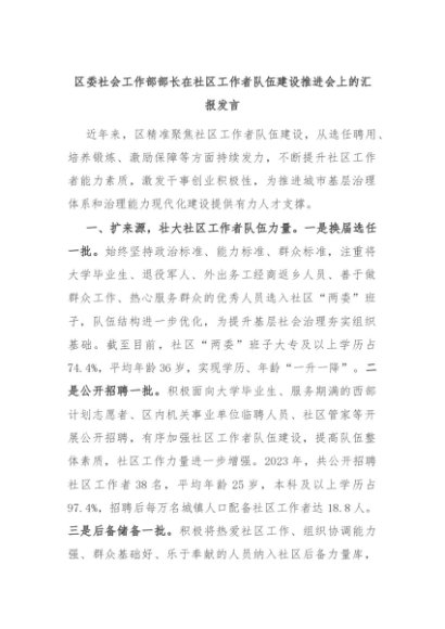 【七哥公文】2024年:区委社会工作部部长在社区工作者队伍建设推进会上的汇报发言+更多免费公文+VX:QiGeGongWen2024