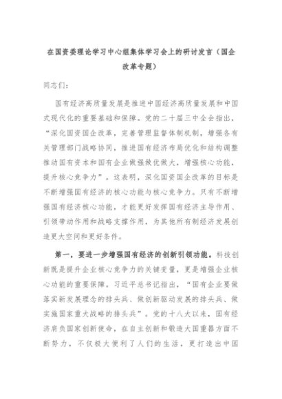 【七哥公文】2024年:在国资委理论学习中心组集体学习会上的研讨发言(国企改革专题)+更多免费公文+VX:QiGeGongWen2024