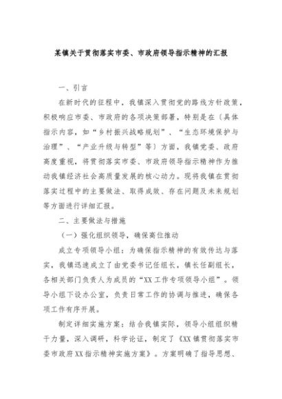 / 【七哥公文】2024年:某镇关于贯彻落实市委、市政府领导指示精神的汇报+更多免费公文+VX:QiGeGongWen2024