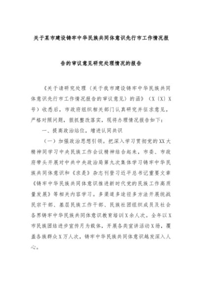 【七哥公文】2024年:关于某市建设铸牢中华民族共同体意识先行市工作情况报告的审议意见研究处理情况的报告+更多免费公文+VX:QiGeGongWen2024
