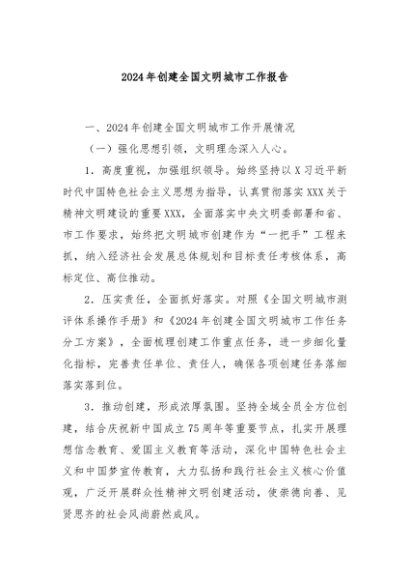 / 【七哥公文】2024年:2024年创建全国文明城市工作报告+更多免费公文+VX:QiGeGongWen2024