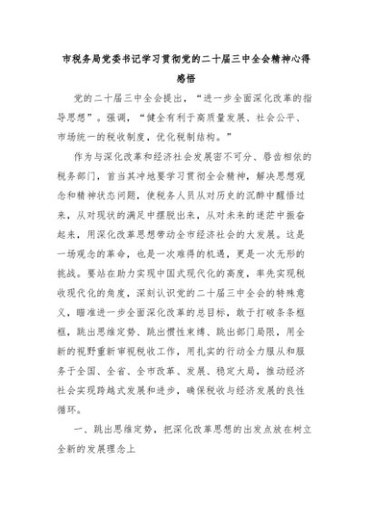 【七哥公文】2024年:市税务局党委书记学习贯彻党的二十届三中全会精神心得感悟+更多免费公文+VX:QiGeGongWen2024