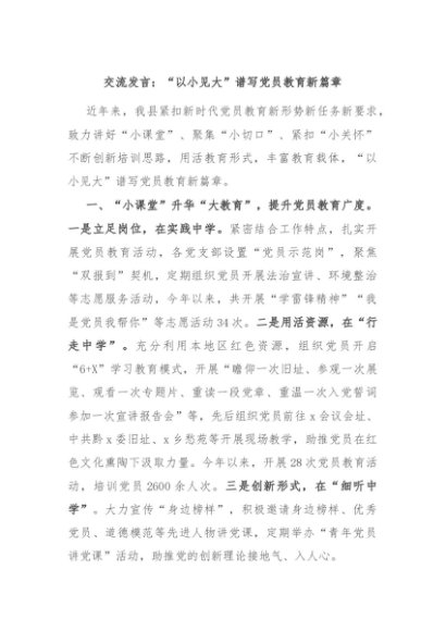 / 【七哥公文】2024年:交流发言:“以小见大”谱写党员教育新篇章+更多免费公文+VX:QiGeGongWen2024