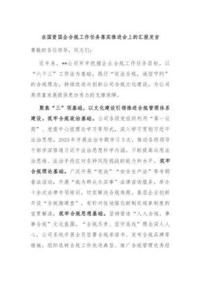 / 【七哥公文】2024年:在国资国企合规工作任务落实推进会上的汇报发言+更多免费公文+VX:QiGeGongWen2024