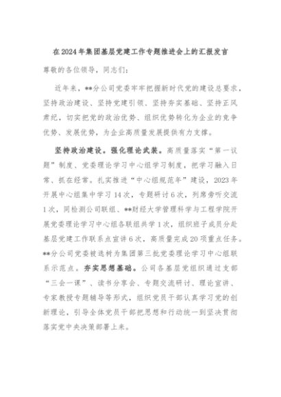 【七哥公文】2024年:在2024年集团基层党建工作专题推进会上的汇报发言+更多免费公文+VX:QiGeGongWen2024