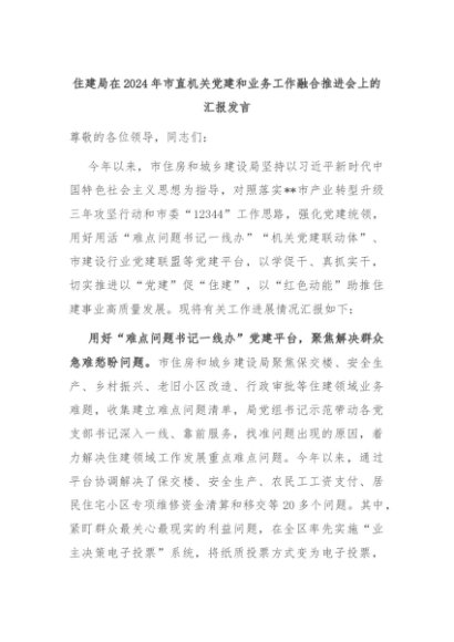 【七哥公文】2024年:住建局在2024年市直机关党建和业务工作融合推进会上的汇报发言+更多免费公文+VX:QiGeGongWen2024