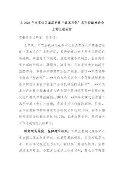 【七哥公文】2024年:在2024年市直机关基层党建“五基三化”系列行动推进会上的汇报发言+更多免费公文+VX:QiGeGongWen2024