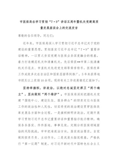 【七哥公文】2024年:市医保局在学习贯彻“7·9”讲话五周年暨机关党建高质量发展座谈会上的交流发言+更多免费公文+VX:QiGeGongWen2024