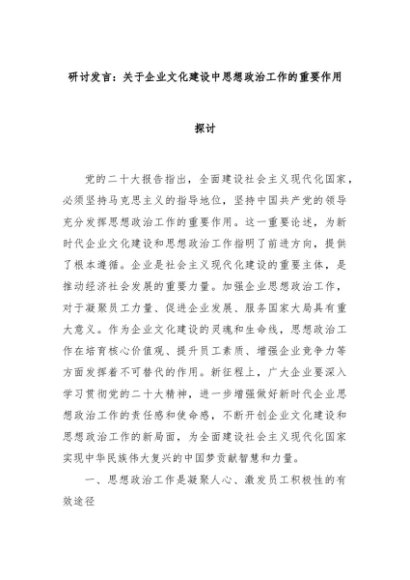【七哥公文】2024年:研讨发言:关于企业文化建设中思想政治工作的重要作用探讨+更多免费公文+VX:QiGeGongWen2024