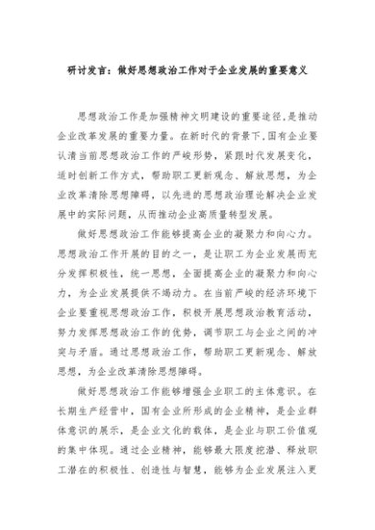 【七哥公文】2024年:研讨发言:做好思想政治工作对于企业发展的重要意义+更多免费公文+VX:QiGeGongWen2024