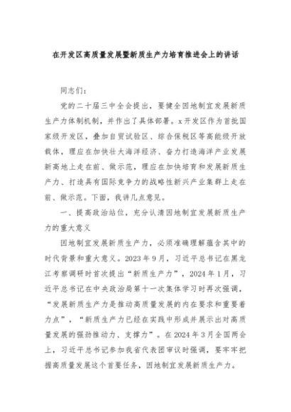 / 【七哥公文】2024年:在开发区高质量发展暨新质生产力培育推进会上的讲话+更多免费公文+VX:QiGeGongWen2024