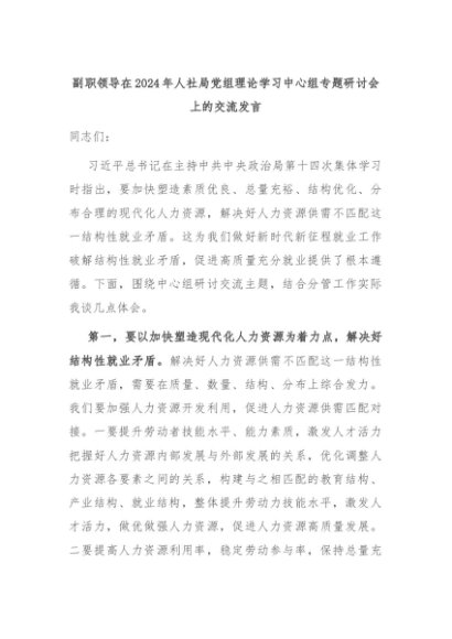 【七哥公文】2024年:副职领导在2024年人社局党组理论学习中心组专题研讨会上的交流发言+更多免费公文+VX:QiGeGongWen2024