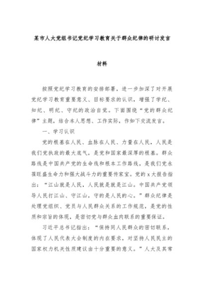 【七哥公文】2024年:某市人大党组书记党纪学习教育关于群众纪律的研讨发言材料+更多免费公文+VX:QiGeGongWen2024