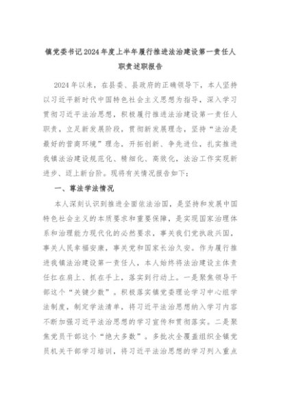 【七哥公文】2024年:镇党委书记2024年度上半年履行推进法治建设第一责任人职责述职报告+更多免费公文+VX:QiGeGongWen2024