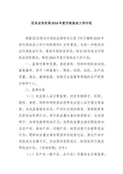 【七哥公文】2024年:区农业农村局2024年度行政执法工作计划+更多免费公文+VX:QiGeGongWen2024