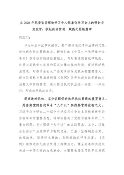 【七哥公文】2024年:在2024年纪委监委理论学习中心组集体学习会上的研讨交流发言:执纪执法贯通,赋能纪检新篇章+更多免费公文+VX:QiGeGongWen2024