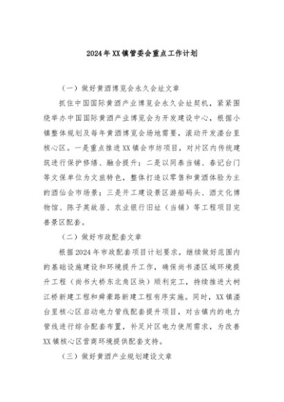 【七哥公文】2024年:2024年XX镇管委会重点工作计划+更多免费公文+VX:QiGeGongWen2024