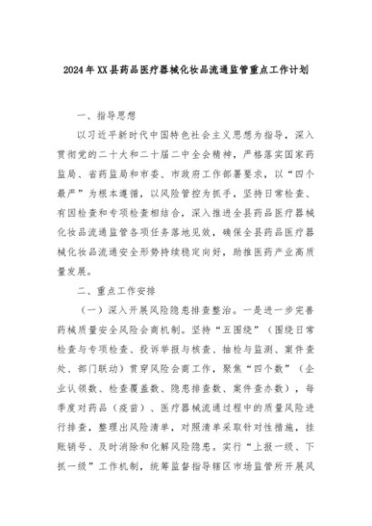 【七哥公文】2024年:2024年XX县药品医疗器械化妆品流通监管重点工作计划+更多免费公文+VX:QiGeGongWen2024