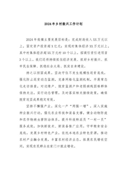 / 【七哥公文】2024年:2024年乡村振兴工作计划+更多免费公文+VX:QiGeGongWen2024