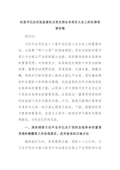 【七哥公文】2024年:纪委书记在纪检监察机关党支部全体党员大会上的纪律党课讲稿+更多免费公文+VX:QiGeGongWen2024