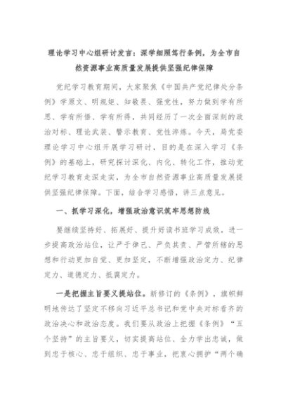 【七哥公文】2024年:理论学习中心组研讨发言:深学细照笃行条例,为全市自然资源事业高质量发展提供坚强纪律保障+更多免费公文+VX:QiGeGongWen2024